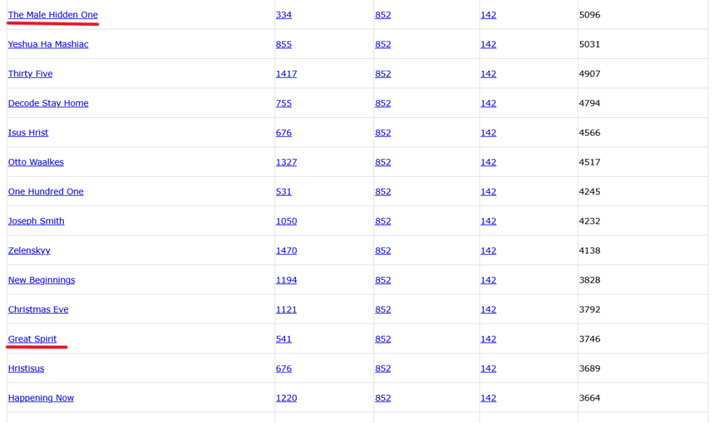 Joseph Smith: English 852 Simple 142. We get matching words such as Male Hidden One, Great Spirit, Christ Consciousness, & Time Travel.